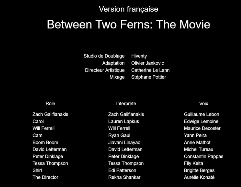 Tout d’abord, le film basé sur le Talk-Show de Zach Galifianakis « Entre Deux Fougères » adapté par Olivier Jancovic et dirigé par Catherine Le Lann chez Hiventy.